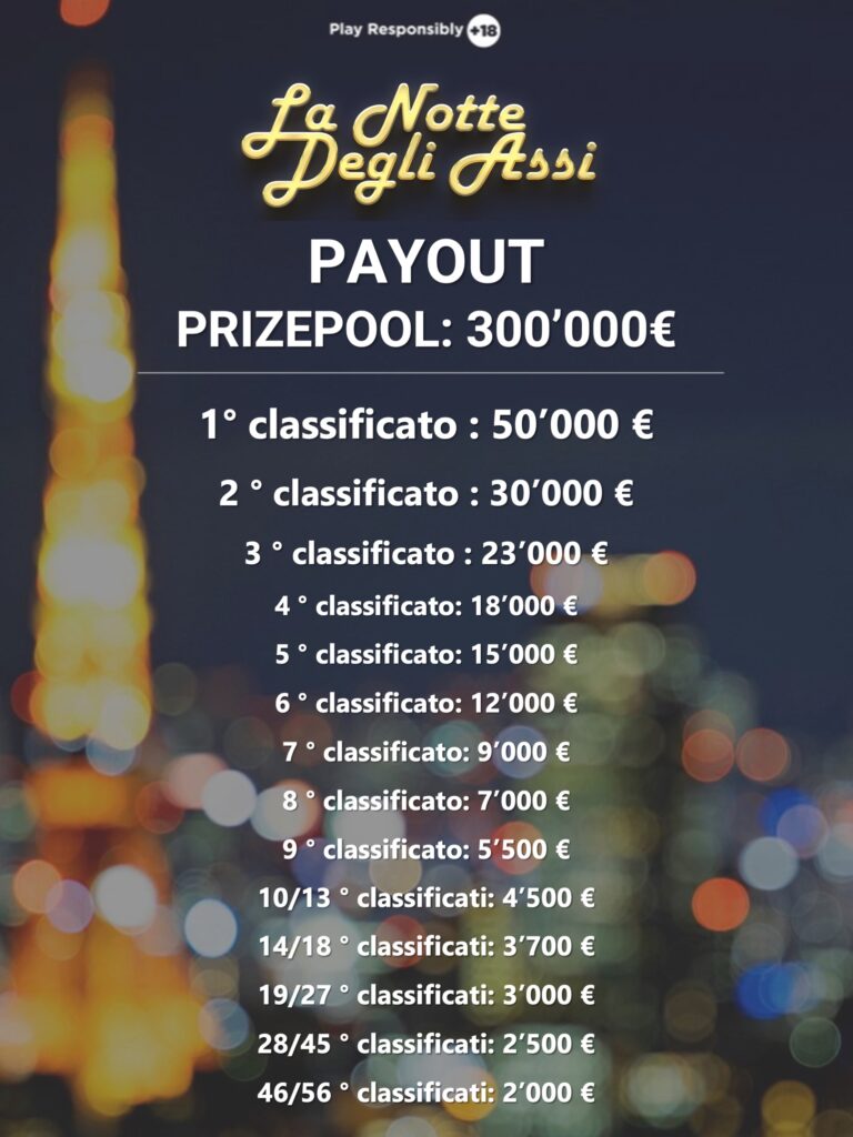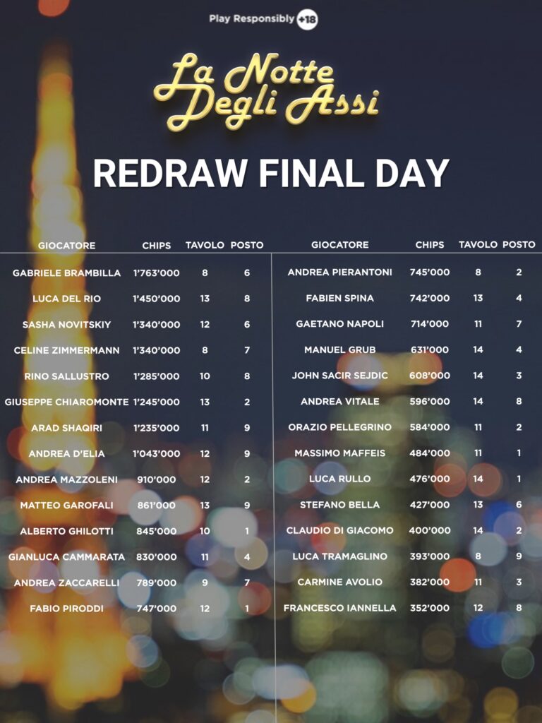 Il Final Day in programma alle 14 riparte dal livello 6’000/12’000 ante 12’000 e tutti i giocatori a premio, con un minimum paid di 1’500€. Chi sarà il prossimo vincitore de La Notte degli Assi?