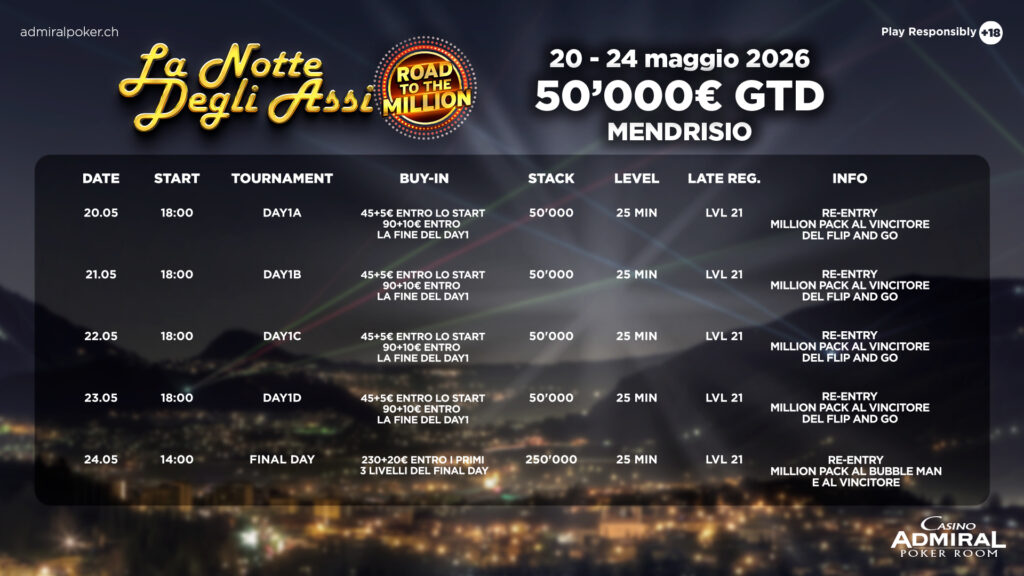 From May 20 to 24, La Notte degli Assi Road To The Million will take place with a guaranteed prize pool of €50,000, giving players the chance to qualify for the prestigious €1 million guaranteed tournament to be held in June at King’s Resort in Rozvadov. The unique feature of the tournament, in addition to offering an entry ticket to the guaranteed million, is that it includes three different buy-in phases on different days of the tournament. La Notte degli Assi Road To The Million begins on Wednesday, May 20, at 6 p.m. with Day 1A, then continues on May 21, 22, and 23 at 6 p.m. with Day 1B, Day 1C, and Day 1D, respectively. In these qualifying flights, the buy-in is only €50 for those who register before the start of Day 1, then increases to €100 for those who wish to register or re-enter in one of the 18 levels of the day. The starting stack for those who register and play Day 1 is 50,000 chips. Very important: to access the €50 buy-in, it is important to register by 6 p.m. Those who are on the waiting list at 6 p.m. are not eligible for the €50 buy-in.