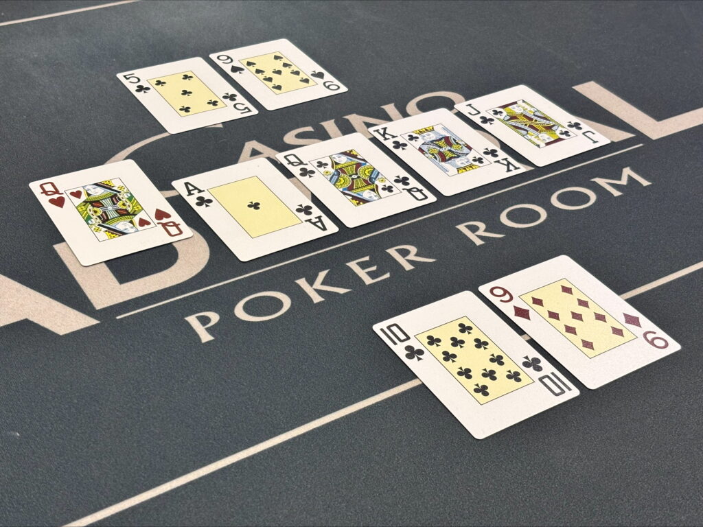 Andrea aveva ricevuto 9♦️ e 10♣️, mentre il banco aveva 9♠️ e 5♣️ e il board recitava: J♣️ K♣️ Q♣️ A♣️ Q ♥️
